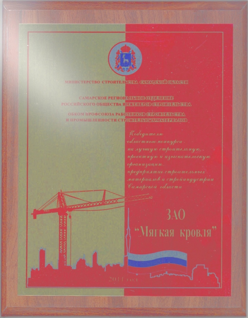 В канун Дня Строителя подведены итоги ставшего традиционным регионального конкурса на лучшую строительную, проектную, изыскательскую организацию, предприятие строительных материалов и стройиндустрии Самарской области. Завод «Мягкая кровля» занял первое место.