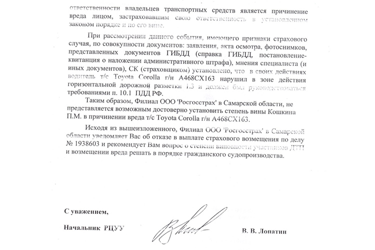 Но по заключению «Росгосстрах» т/с Тойотта нарушила ПДД и выплачивать страховку отказались (см. вложение 1 и 2).